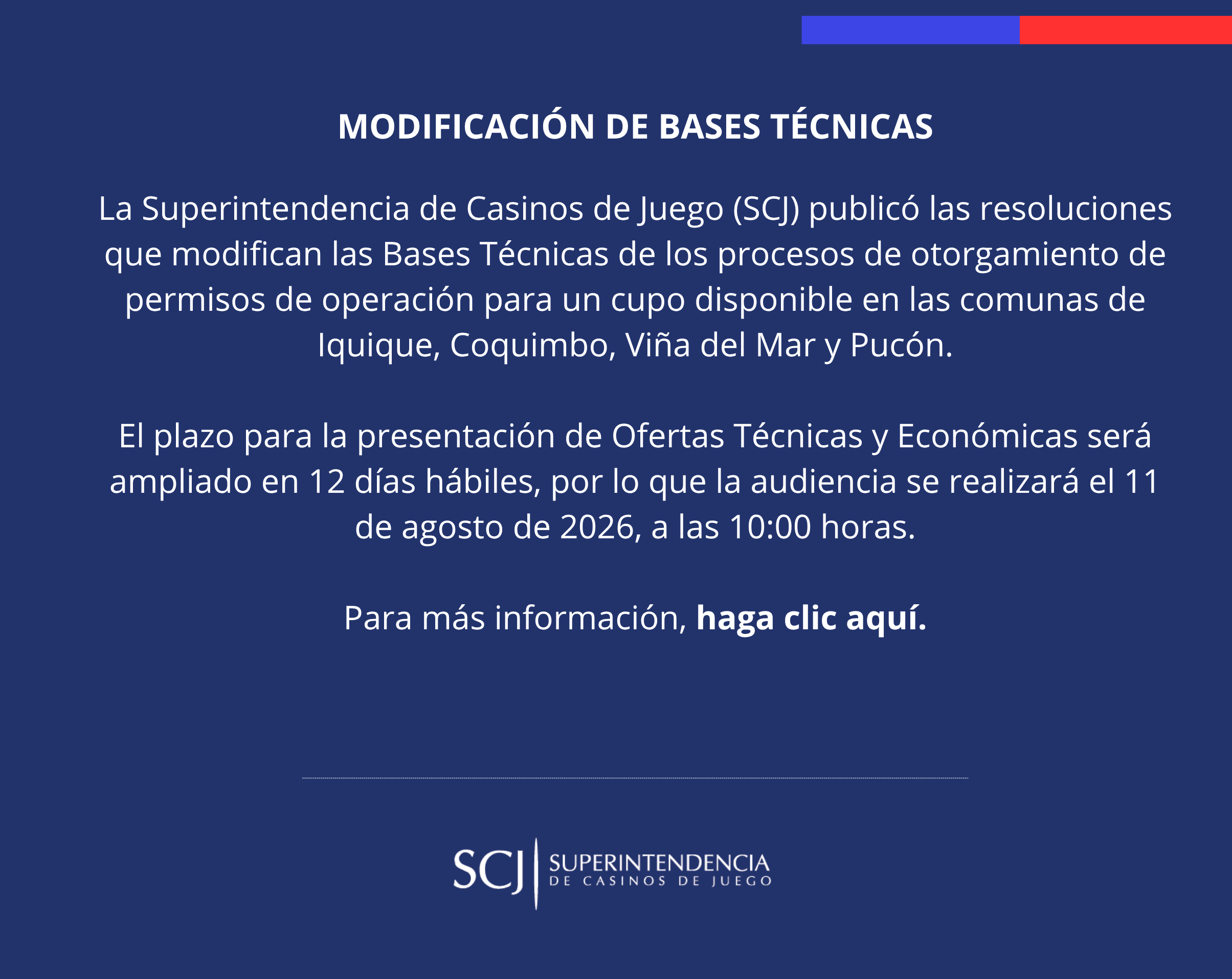 SCJ amplía plazo para dar respuestas formales a consultas y aclaraciones a las bases de los procesos de otorgamiento de permisos de operación en Iquique, Coquimbo, Viña del Mar y Pucón