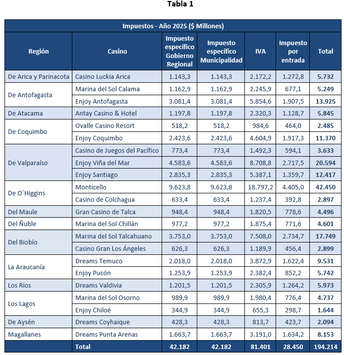 La distribución por casino de los pagos de Oferta Económica efectuados al término de 2025 se detalla en la Tabla 2.